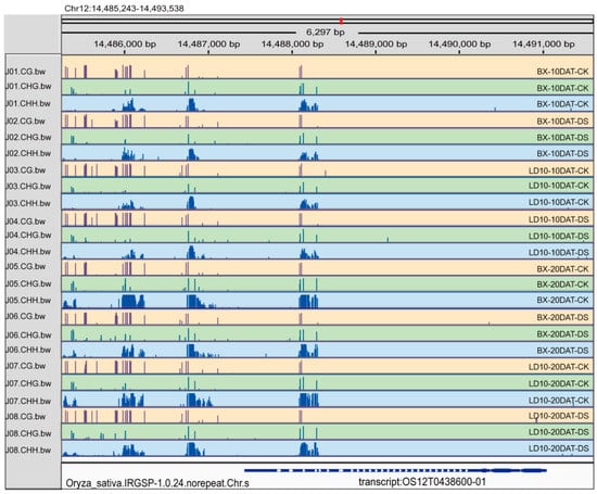 To learn the potential mechanism of the alteration of the gene expression levels for the six DRGs, we performed a global DNA methylome analysis for BX and LD10 determined at the tillering stage (10 DAT). Results suggest that the methylation levels in two rice accessions exposed to either CK or DS exhibit a similar pattern across three types of DNA methylation (CG, CHG, and CHH) (Figure S7). The methylation levels of the CG type are relatively higher than those of the CHG and CHH types. Consistently, we found that a higher abundance of gene methylation levels for both CLT1 and PSBP was detected upstream of the 2k promoter region than in the CDS region (Figure 8 and Figure S8). In addition, we found that the methylation levels of the two genes, i.e., CLT1 gene (Os12g0438600) and PSBP (Os07g0147500), at the 2k promoter region were lower under DS than under CK (Figure 8 and Figure S8). Collectively, we found that the expression levels of two DRGs (CLT1 and PSBP) were positively correlated with trends of δ13C in two rice accessions over two developmental stages during DS; this regulation modern is closely related to DNA methylation regulation.