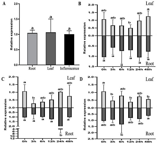 Expression patterns of MsTRX. (A) Expression of MsTRX in alfalfa roots, leaves, and inflorescences. (B) Expression of MsTRX in alfalfa root and leaf under cold stress. (C) Expression pattern of MsTRX in alfalfa root and leaf under drought stress. (D) Expression of MsTRX in alfalfa root and leaf under salt stress. Alfalfa seedlings at 6 weeks old were sampled for tissue-specific expression. MsActin was used as the internal reference. The error bars represented the means ± SDs of three independent biological replicates. The different lowercase represented significant differences (α = 0.05).