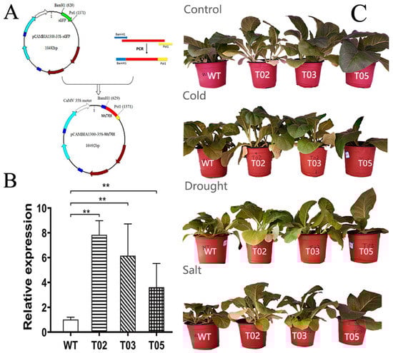 Stress tolerance tests of transgenic tobacco overexpressing MsTRX. (A) The illustration of pCAMBIA1300-35S::MsTRX recombinant vector. (B) Expression of MsTRX in the T2 generation of transgenic tobacco and WT plants. (C) The phenotypes of overexpressed MsTRX tobacco and WT plants under control and cold, drought, and salt treatments. The transgenic tobacco and WT plants at 4 weeks old were treated with 4 °C, 20% PEG-6000, and 150 mM NaCl, individually. WT: wild type. T02: line 2. T03: line 3. T05: line 5. **, p < 0.01.
