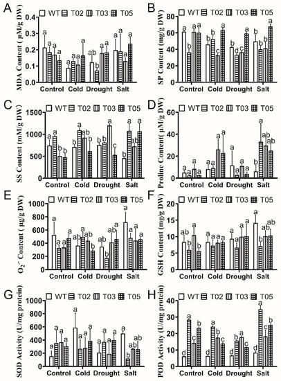 Physiological varieties in overexpressed MsTRX tobacco overexpressing under cold, drought, and salt treatments. (A) Content of malondialdehyde (MDA). (B) Content of soluble protein (SP). (C) Content of soluble sugar (SS). (D) Content of proline. (E) Content of superoxide anion (O2.−). (F) Content of reduced glutathione (GSH). (G) Activity of superoxide dismutase (SOD). (H) Activity of peroxidase (POD). WT: wild type. T02: line 2. T03: line 3. T05: line 5. The error bars represented the means ± SDs of three independent biological replicates. The different lowercase represented significant differences (α = 0.05).
