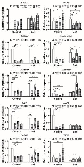 To further illustrate the possible regulatory mechanism of MsTRX in salt tolerance, we investigated the expression level of 10 stress-response genes, namely, BAM1, BAS1, CBSX3, Cu/Zn-SOD, Mn-SOD, ERD10B, GR1, LTP1, SnRK2, and STN7, in transgenic tobacco and WT plants treated with 150 mM NaCl. As compared to WT plants, transgenic tobacco showed significantly lower transcription levels for CBSX3, Cu/Zn-SOD, Mn-SOD, ERD10B, GR1, LTP1, and SnRK2. The expression levels of BAS1 and STN7 in line T05 were markedly higher than those in WT plants (Figure 4). Despite the upregulation of BAM1 and LTP1 in transgenic tobacco plants under salt stress, no significant differences were found between transgenic lines and WT plants. Salt stress upregulated the expression of CBSX3, Cu/Zn-SOD, Mn-SOD, GR1, ERD10B, and SnRK2, but the expression levels of Cu/Zn-SOD, Mn-SOD, and GR1 were much lower in transgenic tobacco plants. Meanwhile, the expression levels of ERD10B and SnRK2 in line T03 were higher than that in WT plants. The expression of both BAS1 and STN7 was downregulated in transgenic tobacco under salt stress, but the expression level of BAS1 was significantly lower than that in WT plants. Conversely, the expression level of STN7 was higher than that in WT plants.