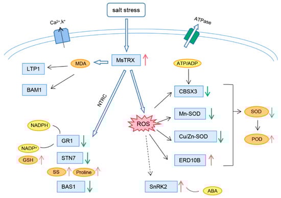 Therefore, we hypothesized that MsTRX might be involved in a complex regulatory network that affects physiological changes and gene expression in plants (Figure 5). The overexpression of MsTRX produced an increase in SS and proline accumulation to maintain osmotic homeostasis, as well as an increase in POD activity to scavenge ROS, and induced the upregulation of BAM1, LTP1, CBSX3, Cu/Zn-SOD, Mn-SOD, GR1, ERD10B and SnRK2, as well as the downregulation of BAS1 and STN7 under salt stress.