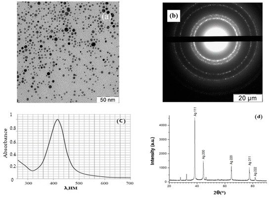 The data of electron microdiffraction (Figure 1b,d) on the crystalline phase of the samples were in full agreement with the results of X-ray phase analysis. The distances between the atomic planes of the crystal lattice (d-spacing) were determined by measuring the diameters of the first four rings in the diffraction pattern. The identity of the values of the first four d-distances in the diffraction pattern obtained from a sample of PHMB-stabilized Ag NPs (2.34, 2.01, 1.43, 1.22 Å), and the standard (metallic silver) (2.36, 2.04, 1.44, 1.23 Å) confirmed that Ag NPs had a crystalline structure of metallic silver [29]. In the diffraction pattern obtained from the passage of an electron beam with an energy of 100 keV through the selected region of the sample of NPs stabilized by PHMB, lines of the amorphous phase (2–2.3 Å) were also recorded, which also confirms the presence of disordered polymer molecules of the stabilizer on the surface of Ag NPs.