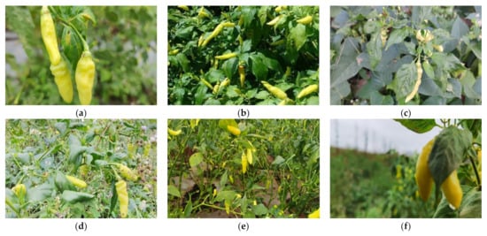 Images of Xiaomila green pepper under different conditions. (a) A single cluster of Xiaomila green pepper, cloudy, with no obvious occlusion; (b) a cluster of Xiaomila green peppers, sunny, with backlight; (c) Xiaomila green peppers covered by leaves; (d) in the afternoon with sufficient light, covered by branches and pedicels; (e) small target of Xiaomila green peppers, in the early morning, covered by branches; (f) fruit hanging with dew.