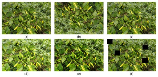 Considering the impact of the complex environment of the Xiaomila green pepper picking process on fruit recognition, image rotation, image mirror flipping, image noise addition, and image brightness and contrast adjustment were performed to reduce the impact of the complex posture of the pepper fruit on the network performance. By changing the brightness and contrast of the image, the brightness deviation caused by ambient lighting changes and sensor differences was reduced, and the Cutout method was adopted to randomly select multiple fixed-size square areas to fill zero-pixel values. Meanwhile, center normalization operations were performed to simulate complex environments and remove the occlusion of the leaves on the Xiaomila green pepper fruit. The result of the data augmentation method is shown in Figure 3. The final training set consists of 8400 images, which were used as final training set data of the object recognition, including 7560 augmented images and 840 original images. There is no overlap between training and test set. The images were manually annotated with LabelImg (https://github.com/tzutalin/LabelImg (accessed on 8 June 2022)), and the smallest closed rectangle of the Xiaomila green pepper fruit is annotated (fruit with a relatively small pixel and a visible part of less than 20% were not labeled). All annotation files were saved and converted to TXT files.