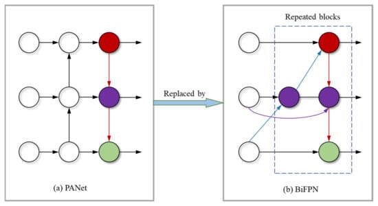 Using BiFPN instead of PANet to improve the feature fusion network. The colored circles represent features at different scales. (a) PANet adopts bottom-up and top-down paths to fuse multi-scale features; (b) BiFPN uses the strategy of bottom-up and top-down bidirectional feature fusion.