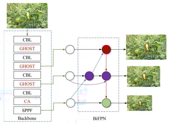 In general, due to the complex working environment of the picking robot, it is difficult for the acquired images to have the same initial resolution. Therefore, to identify the multi-scale Xiaomila green pepper fruit of millet, this paper changes the neck module to improve fruit detection accuracy. Although PANet in YOLOv5 achieves good results in multi-scale fusion by down-sampling and up-sampling [33], it is computationally expensive. By contrast, BiFPN can achieve a fast and simple multi-scale feature fusion. It adopts cross-scale connections to remove nodes in PANet that contribute less to feature fusion and adds additional connections between the input and output nodes at the same level [34]. This study adopts the single-layer structure BiFPN instead PANet to improve the training efficiency, as shown in Figure 7.