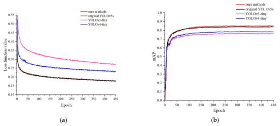 Because our method makes changes to the model structure, the official pre-trained weights for YOLOv5 cannot be used. Therefore, the improved YOLOv5s model was trained without pre-weighting. Meanwhile, the training data were saved and updated to the latest weight file to pre-train the weights, and the training was resumed after a training interruption. The training data of each iteration were saved to compare and analyze the performance of each model.