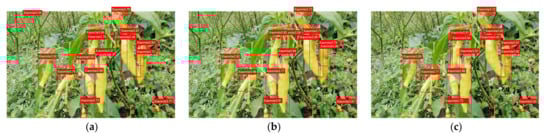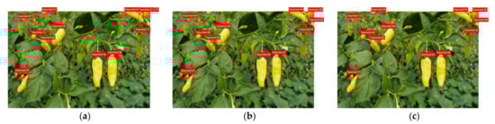 In multi-scale detection, although the YOLOv5s detection model has an excellent performance in scale matching, the targets in the Xiaomila green pepper dataset are densely distributed, and the targets of various sizes are often alternately distributed, as shown in Figure 13. Furthermore, when feature fusion is performed, the negative sample area of the small target detection layer may appear as a positive sample in other effective feature layers, and the conflict between the positive samples and negative samples of each effective feature layer is more obvious in the Xiaomila dataset, as shown in Figure 14.