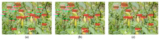 Comparison of the detection results of different models in small target detection. (a) YOLOv5s-CFL detected all labeled targets; (b) YOLOv5s missed one fruit covered by leaves; (c) YOLOv3-tiny missed fewer fruits covered by leaves.
