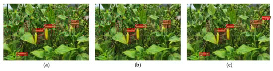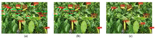 Aiming at the problem of branch and leaf occlusion, misidentified samples are rare when the fruit of Xiaomila green pepper is large. When the Xiaomila green pepper fruit has a similar size to the leaves, it is difficult to detect even with the human eye because the fruit color and size are very similar to the background leaves. The test results show that the four models have different performances. During the detection process, when the size and color of the fruit and the leaf are similar, the YOLOv3-tiny model incorrectly judges that the leaf and pedicel as the Xiaomila green pepper fruit, as shown in Figure 15. In terms of missed detection, the lightweight model achieves the highest missed detection rate for the Xiaomila fruits.