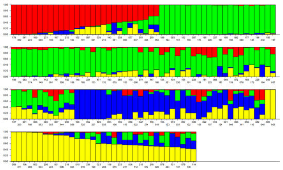 Four subgroups of 185 materials based on the Structure 2.5 hybrid model. Each rectangular bar represents one copy of the accession, and its probability of being classified into one of the four subpopulations can be determined by the length of the differently colored (red, yellow, green, blue) lines. Y-axes, Q value; X-axes, the ID of each accession (the same characters “11HX-” of each ID was omitted).