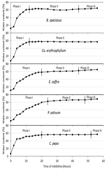 The time required for the seeds to reach the critical water level (the point beyond which the seeds transit from phase I to phase II or minimum seed water content and below which germination is blocked) varied among the species, ranging from 18 h in B. speciosus and Co. erythrophyllum to 24 h in E. caffra and Cu. pepo (Figure 1). P. sativum reached the critical water level at 32 h of imbibition. The variation in the time required for the seeds to reach the critical water level may have been due to variations in the seed tissue water potential of the test species and/or the resistance of the seed coat. It has been reported that rapid water intake occurs in seeds because of the huge difference between seed tissue water potential and the ambient water potential of pure water [42]. These huge differences between dry seed tissue water potential and the ambient water potential (in the case of pure water) result in rapid influxes of water during phase I of water imbibition (Figure 1).