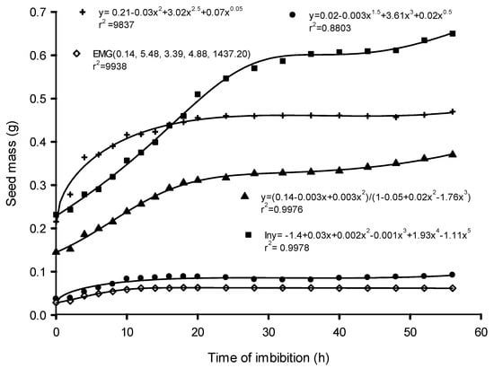 Phase II is the lag period (Figure 1). During this phase, there was little or no uptake of water, resulting in only a small change in fresh seed mass and a slight decline in mass in some instances (Figure 2). The slight loss of seed mass may have been due to the loss of mucilage surrounding the seeds. Water always flows from an area of higher to lower water potential and the net flow stops when the difference in water potential becomes zero—an indication of the beginning of phase II of the water imbibition process. While dry seed tissues have been reported to have a water potential (Ψ) of between −350 and −50 MPa, pure water has a water potential of zero. Uptake of water by seeds is a physical process and results in seed mass increase (Figure 2). Although not investigated in this study, as water imbibition increases, a series of physiological, metabolic, and biochemical processes are triggered [42]. The activation of different metabolic processes with water uptake by seeds may lead to an increase in respiration and the beginning of sugar consumption [42]. The sugar serves as a substrate for seed embryo respiration. Sugars such as sucrose and glucose are carbon sources for the production of metabolites, including amino acids, lipids, proteins, and complex carbohydrates such as starch and cellulose [30,43]. All these lead to initial radicle extension due to reversible (“elastic”) growth driven by osmotic water uptake [32]. The small amount of water uptake by seeds in phase II may also be due to changes in osmotic potential resulting from reserve degradation [30,32].