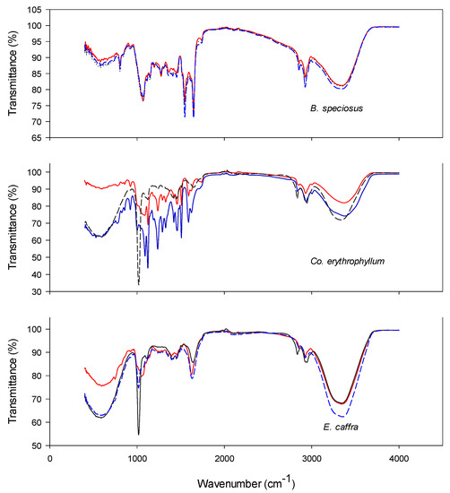 FTIR of Bolusanthus speciosus, Combretum erythrophyllum, and Erythrina caffra at 0 (blue), 20 (black), and 32 (red) d of controlled deterioration. Seeds were subjected to controlled deterioration at 40 °C and 100% relative humidity. Samples were taken at intervals of 4 d and the samples were subjected to both germination and electrolyte conductivity measurements.