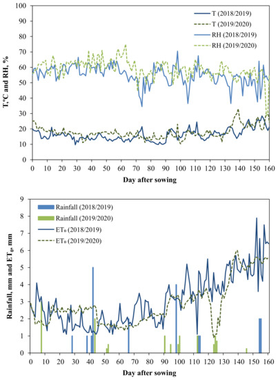 Field experiments were conducted during the two successive seasons of 2018/2019 and 2019/2020 in the Qarun Kebili region, El Fayoum, Egypt. This region has an altitude of 17 m above sea level at 29°21′55″ N latitude and 30°27′11″ E longitude. The experimental site has a semi-arid climate, as shown in Figure 1, with air temperature (T), relative air humidity (RH), rainfall, and reference evapotranspiration (ET0). From November to April, the average T and RH concentrations were 16.2 °C and 54.9% in the first growing season, respectively, and 17.9 °C and 58.9% in the second growing season, respectively. The rainfall received in the first growing season was 20 mm, while in the second growing season it was 12.2 mm. In the first and second growing seasons, ET0 was 490.7 mm and 459 mm, respectively. In Table 1, the physical (i.e., texture, bulk density, field capacity, wilting point, and saturated hydraulic conductivity) and chemical (i.e., electrical conductivity, pH, organic matter, and soluble cations and anions) soil properties of the site were determined at two soil depths (10–30 and 30–60 cm) after eliminating the top soil, by standard procedures according to Page et al. [59] and Klute [60]. The soil of the experimental site had a loamy sand texture. The water used to irrigate the experimental site had a pH of 5 and an electrical conductivity of 2 dS m−1 for the experimental period.