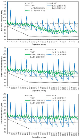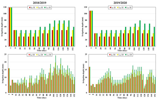 The with the CROPWAT model was estimated at 370.8 mm in the 2018/2019 season and 336 mm in the 2019/2020 season. The values’ SI treatments were higher in the 2018/2019 season (on average, 325 mm) than in the 2019/2020 season (on average, 313.3 mm) (Figure 11). Knežević et al. [81] reported that values of winter wheat in Serbia were 345.4 mm and 463.3 mm on soils with a medium and high TAW, respectively, obtained with the CROPWAT model under rainfed conditions. In the I80 treatment, the obtained values with DI were around 5 mm and 13 mm in the first and second seasons, respectively, which were lower than those obtained with SI. The I80 treatment with DI had the highest values of DIS (13.8% and 10.9%) in both seasons. On the contrary, in the I100 and I120 treatments, the values for DI were greater, on average, by 13.8% and 7.1%, than those for SI. Therefore, the I100 and I120 treatments with DI had the lowest values of DIS (on average, 0.5% and 0.4%, respectively).