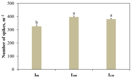 Number of wheat spikes under three irrigation levels in the 2019/2020 growing season (values are averages of two irrigation systems). According to the least significant difference test at p < 0.05, the same letters indicate statistically no significant differences. I80 = 80% crop evapotranspiration (ETc), I100 = 100% ETc, and I120 = 120% ETc. Vertical lines give the means ± SE of the mean (n = 8).