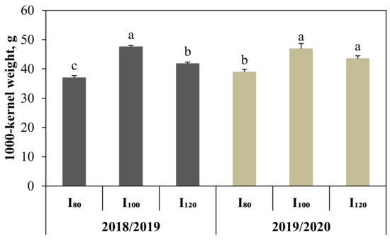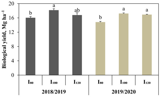 1000-kernel weight and biological yield in wheat under three irrigation levels in each growing season (values are averages of two irrigation systems). According to the least significant difference test at p < 0.05, the same letters within a growing season indicate statistically no significant differences. I80 = 80% crop evapotranspiration (ETc), I100 = 100% ETc, and I120 = 120% ETc. Vertical lines give the means ± SE of the mean (n = 8).
