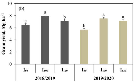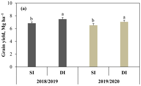 As shown in Table 2, irrigation level treatments had a significant (p < 0.05) effect on grain yield regardless of the irrigation system in both seasons. The average values of grain yield under DI were 7.46 and 7.03 Mg ha−1, respectively, in 2018/2019 and 2019/2020, whereas the values under SI were significantly (p < 0.05) decreased by 8.50% and 7.50%, compared with those of DI (Figure 5a). Irrespective of the irrigation systems, the value of grain yield for I100 (7.89 and 7.52 Mg ha−1) was significantly (p < 0.05) the highest, followed by I120 (decreasing by 10.05% and 5.29%, respectively) and later by I80 (decreasing by 18.34% and 24.58%, respectively) in 2018/2019 and 2019/2020 (Figure 5b). According to Mugabe and Nyakatawa [76], applying 75% of the wheat crop’s water requirements reduced yields by 12% in two years. Low yields in the case of deficit irrigation, especially in cases of water limitation, may be offset by increasing production with additional water supply through deficit irrigated areas [77]. Table 2 shows that the interaction between irrigation systems and irrigation levels was significant (p < 0.05) in 2018/2019 but not significant (p > 0.05) in 2019/2020. In 2018/2019 (Figure 6), the I100 with DI treatment (8.21 Mg ha−1) had the highest grain yield, but without significant differences with the I120 with DI and I100 with SI treatments. The I80 with DI treatment (6.34 Mg ha−1) had the lowest value, but without significant differences with the I120 with SI and I80 with SI treatments. Finally, there were non-significant effects (p > 0.05) on the harvest index (Table 2).