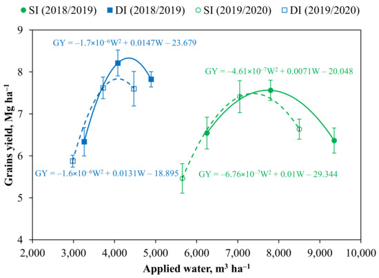 Relationship between grain yield (GY) and applied water (W) under different irrigation systems. SI = surface irrigation, and DI = drip irrigation. Vertical lines give the means ± SE of the mean (n = 4).