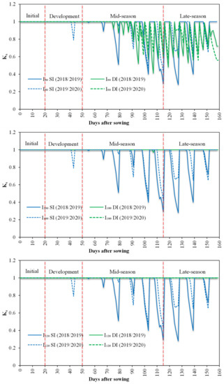 - The daily ET0 values were calculated using the Penman–Monteith FAO-56 equation (Equation (2)), which was based on climatic data from the Central Laboratory for Agricultural Climate’s Meteorological Data, as well as the daily rainfall data, for the seasons of 2018/2019 and 2019/2020. The actual crop evapotranspiration was estimated by multiplying ET0, Kc, and 0.8, 1, or 1.2. The efficiencies of SI and DI were estimated through field investigation, which was about 69% and 93%, respectively. Irrigation application depth was then estimated at irrigation events for SI and DI, as shown in Figure 2.