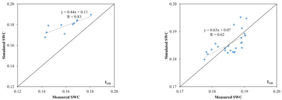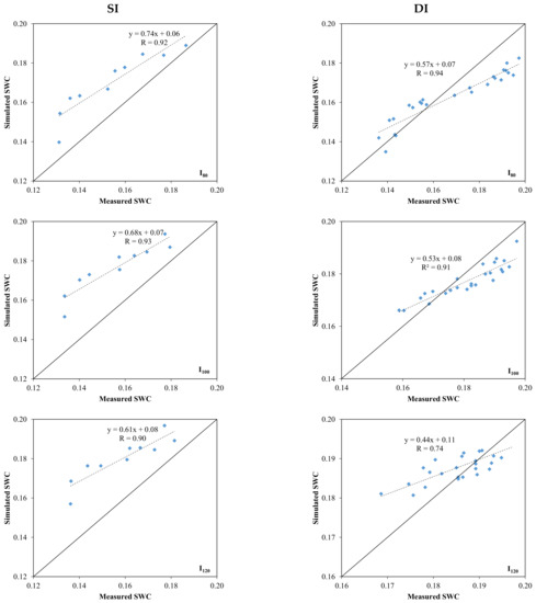 Figure 11 indicates the effect of irrigation scheduling on grain yield potential. During the I80 treatment with DI in the 2018/2019 and 2019/2020 seasons, tests of irrigation levels across irrigation systems showed significant yield reduction results (24.5 and 19.3%, respectively), while yield reductions across the irrigation level treatments under SI were similar in each season (21.7% in 2018/2019 and 12.2% in 2019/2020). The relative yield obtained with the simulations was compared with the measured yield. The GYmax ranged from 7.48 Mg ha−1 with SI in the 2019/2020 season to 8.33 Mg ha−1 with DI in 2018/2019 (Figure 7). The highest relative yields were achieved with irrigation-level treatments under DI (RE between −0.78% and 7.65%) in both seasons. In SI, the highest relative yield (99%) was estimated in 2019/2020 with I120 treatment (RE of −1%), while the lowest relative yield (78.35%) was estimated in 2018/2019 with I100 treatment (RE of −21.65%). According to the results of the CROPWAT model in study of Zhou and Zhao [82], an appropriate SI schedule for wheat in sandy soil included more frequent irrigation and lower application depth; this schedule can reduce deep percolation and save approximately 10–20% of irrigation water without affecting crop yield.