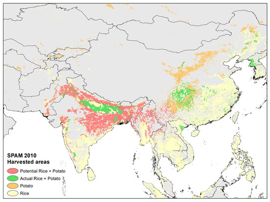 Potato- and rice-harvested areas estimated from SPAM 2010 [31] for Asian countries.