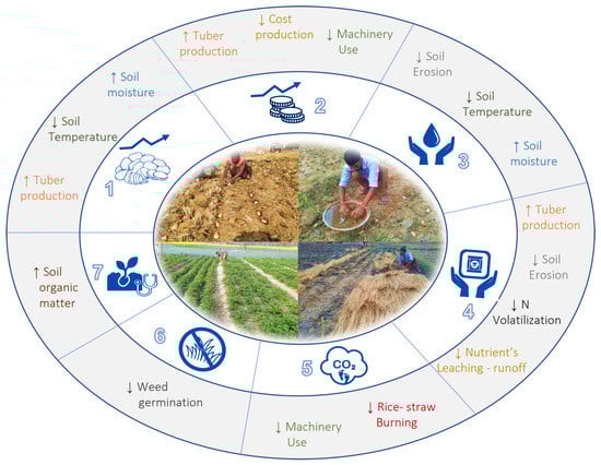 The main processes triggered by zero/minimum-tillage and/or mulching under potato cultivation reported by the literature that improve crop yield (1), profitability (2), nutrient-use efficiency (3), water productivity (4), C footprint (5), weed control (6) and soil organic carbon (soil health) (7).