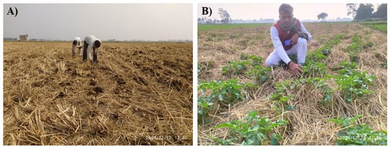 Potato cultivation under zero-tillage and rice-straw mulching (PZTM) on-farm demonstration trials in Patna district, Bihar-India. After rice harvesting, potatoes seeds are placed in soil (A) and covered by manure and rice-straw mulch. Around 30 days after plating, emerged plants overpass the mulch (B). Photo credit: Suresh K. Kakraliya.