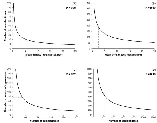 Following the enumerative sequential sampling plan, a sample size of 31 trees is required for estimating an average density of 2.5 egg masses/tree (i.e., economic damage threshold) with a precision level of 0.25. This value is lower than that of 40 cork oaks sampled with the conventional sampling protocol proposed by Fraval and collaborators []. Contrarily, when the level of precision of 0.10 was set, the number of trees needed to be sampled was considerably higher (191) than the standard sampling method. Since a level of precision of 0.25 is adequate for extensive monitoring protocols [], an enumerative sampling plan at P = 0.25 can be suitably applied to minimize the effort in sampling egg masses in Mediterranean cork oak forests. Although a higher number of samples should be necessary to estimate the moth density at low population level, the proposed method can be quite adequate to support control programs against L. dispar because it provides information about whether or not the pest reaches an economic damage threshold.