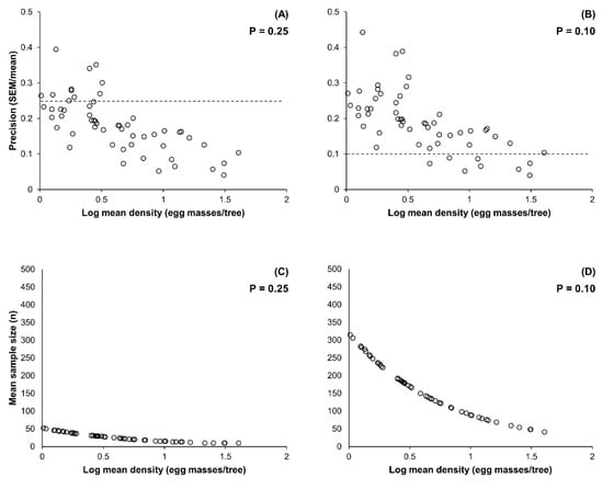 The results of the validation of Green’s sequential sampling plan are reported in Table 2. The mean precision of the sequential sampling plan at P = 0.25 (0.183) was better than the desired precision, although it was slightly worse than that at P = 0.10 (0.190). The precision of the sequential sampling plans was poorer than the desired levels in correspondence to the lowest values of population density both at the precision level of 0.25 (Figure 2A) and 0.10 (Figure 2B). Mean sample size was 27.3 trees at p = 0.25 (Table 2) and it increased meaningfully to 164.7 trees at the precision level of 0.10 (Table 3). Mean sample size decreased with the increase in population density at both precision levels (Figure 2C,D).