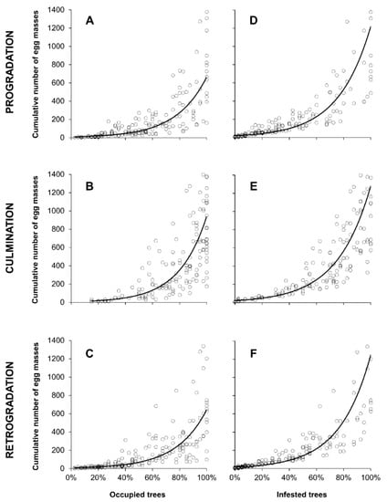 Relationship between the cumulative number of Lymantria dispar egg masses and the percentage of occupied (with one or more egg masses) and infested (with three or more egg masses) trees. Linear regressions were fitted separately for each phase of gypsy moth population development: progradation (A,D), culmination (B,E), retrogradation (C,F).