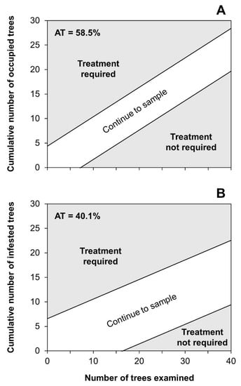 A binomial sampling plan was generated using the datasets used for developing Green’s enumerative sampling plan. Two different binomial plans were developed, relying on the relationship between the percentage of occupied (i.e., percentage of trees with 1 or more egg masses) and infested trees (i.e., percentage of trees with 3 or more egg masses), and pest density. Two different binomial sampling plans were generated using the tally thresholds of 1 and 3. The tally threshold is the minimum number of egg masses required to classify a tree either as occupied (2) or infested (1) by L. dispar. Validation was carried out separately for each population development phase (i.e., progradation, culmination, retrogradation). Wald’s sequential probability ratio test (SPRT) [] was used, and stop lines were generated using the RSVP software []. Stop lines were generated considering the upper (θ1) and lower (θ2) boundaries for the decision AT and α (type I) and β (type II) errors, which indicate either the probability of treating when pest density is below the defined AT or the probability of not treating when pest density exceeds the AT, respectively. The θ1 and θ2 were set at 10% above and below the AT, respectively, whereas a value of 0.10 was used for both α and β errors. The validation process was carried out using 500 resampling iterations with replacement, and the minimum sample size was arranged considering the x-axis intercept of the lower stop line.