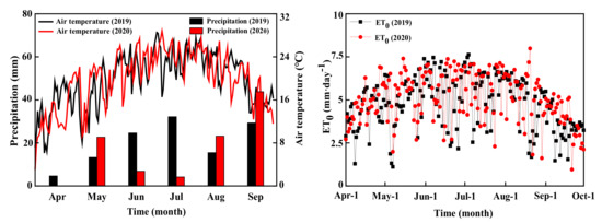 Monthly precipitation amounts and daily air temperature (Left), and evapotranspiration (ET0) (Right) in the experimental area during a maize growth period.