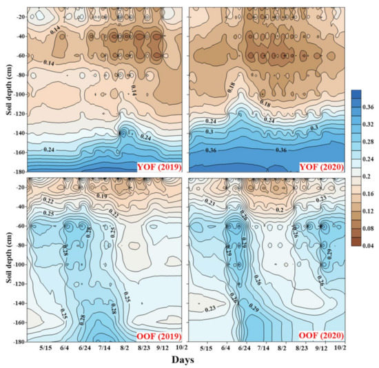 Figure 4 illustrates the spatiotemporal variability in daily soil water content (SWC) in the growing season of 2019 and 2020. Overall, SWC dynamics responded to irrigation, and distinct spikes appeared after each irrigation event. SWC in deep soil (120–180 cm) was higher than that in upper (0–60 cm) and middle soil layers (60–120 cm). The lowest value of SWC in the YOF and the OOF was 0.046 and 0.137 cm3·cm−3 at 40–60 cm and 10–20 cm depths, respectively, and 0.39 cm3·cm−3 in the YOF and 0.35 cm3·cm−3 in the OOF at 180 cm depth. SWC fluctuated sharply in upper and gently in deep soil. The isopleth of SWC in upper soil was dense and curved, while in the deep layer it was loose and smooth, indicating the changes in SWC in the upper layer fluctuated in deep soil. SWC also changed with stages of maize growth. The lowest SWC occurred at tasseling and milking.