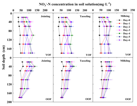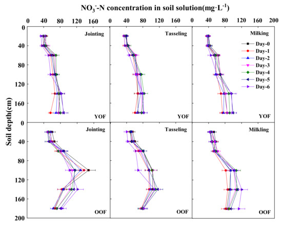 With fertilization and at the jointing stage, NO3−-N in the OOF reached the maximum in the upper soil (0–60 cm) on day four, NO3−-N peak in the middle layers (60–120 cm) was observed on day five, while peak in deep layers (120–180 cm) was observed on day six. A NO3−-N peak in the 0–100 cm layer in the YOF was observed 1–2 days earlier than that in OOF. At tasseling and milking stages in both fields, NO3−-N dynamics exhibited the same trend as for the jointing stage, but peak NO3−-N was observed 1–2 days earlier than at the jointing stage.