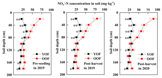 Soil NO3−−N in the 0−200 cm soil profile. Error bars represent standard deviation. ** and * represent p < 0.01 and p < 0.05 between the young oasis field (YOF) and old oasis field (OOF) at the same depth, respectively.