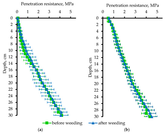 No other research on the investigation of the changes in soil PR after the weed control process could be found, so comparisons were made with tillage in the topsoil. Gürsoy et al. [70], evaluating tillage practices, found that soil PR was lowest (1.62 MPa) with conventional tillage at 0–10 cm depth, while there was no difference between 10–20 and 20–30 cm depth. Koch et al. [63], using shallow-mixing conservation tillage to a depth of 10 cm, found an increase in soil PR of about 1.5 MPa at 10–15 cm depth and no change at 25–27 cm depth. These results correlate with our results, as the differences were only found in the topsoil. Other researchers who have studied minimum tillage, consisting of only rotary hoeing to 10 cm depth in silty-clay soils have obtained results similar to ours: PR was 0.66 MPa at 3.5–14 cm depth and 1.93 MPa at 14–28 cm depth [71].
