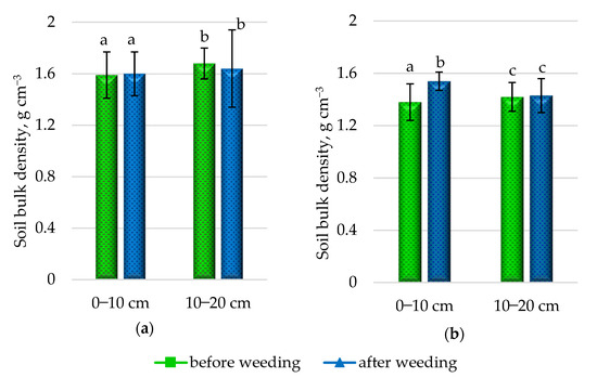 Soil bulk density before and after the weed control process at depths of 0–10 and 10–20 cm: (a) CWC2 (4 June 2021); (b) RWC (1 July 2021). Different letters a, b, and c in the figures indicate statistically significant differences.