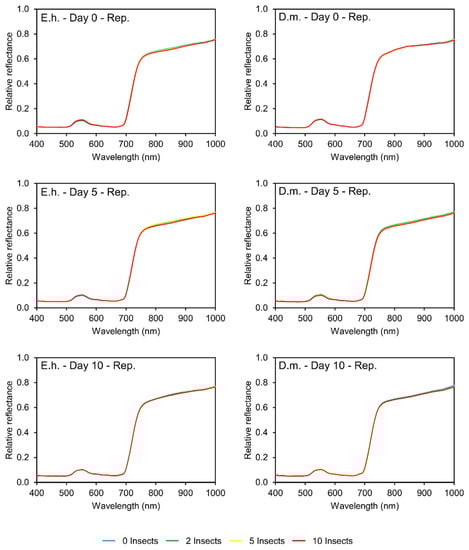 Spectral curves (400–1000 nm) of soybean leaves (0, 5, and 10 days after infestation) under different levels of stinkbug infestation (left column)—Euschistus heros (E.h.); (right column)—Diceraeus melacanthus (D.m.).