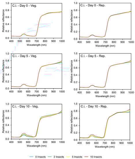 Spectral curves (400–1000 nm) of soybean leaves (0, 5, and 10 days after infestation) from plants under different levels of Chrysodeixis includens (C.i.) infestation (left column)—soybean vegetative period; (right column)—soybean reproductive period.