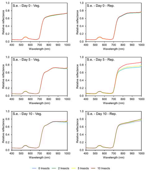 Spectral curves (400–1000 nm) of soybean leaves (0, 5, and 10 days after infestation) from plants under different levels of Spodoptera eridania (S.e.) infestation (left column)—soybean vegetative period; (right column)—soybean reproductive period.