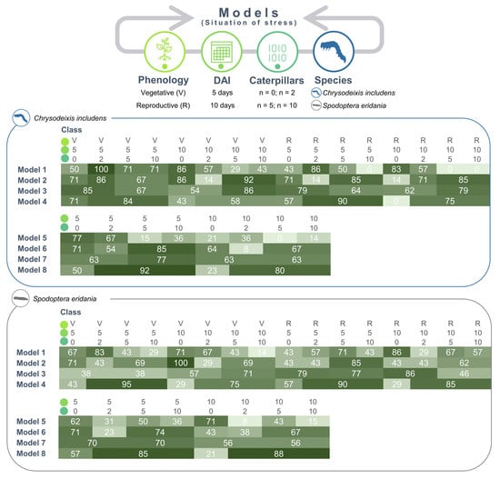 The MLP-ANN was used to automatically discriminate the health conditions of soybean plants regarding the following situations of stress: soybean phenology (vegetative (V) and (+) or (;) reproductive (R) stages), infestation period (5 or (;) 10 days after caterpillar infestations (DAI)), and combinations of different caterpillar densities (0, 2, 5, and 10 caterpillars (C. includens and/or S. eridania) per cage with five plants), which generated eight situations of stress (Table 3, Table 4 and Table 5). The MLP-ANN model was built to calibrate the model performance in the discriminate analysis of soybean plants with the training dataset, and the testing dataset was used to validate the neural model. This study classified the health condition of soybean plants in vegetative and/or reproductive phenological stages into three groups. The first was to discriminate soybean plants injured by any of the caterpillar species (C. includens and S. eridania) (Table 3). The second was to discriminate soybean plants injured by only C. includens (Table 4). The third was to discriminate soybean plants injured by only S. eridania (Table 5).