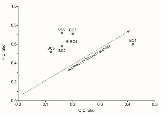 Van Krevelen’s diagram for examined biochars. The arrow indicates direction of changes in expected biochar’s stability.