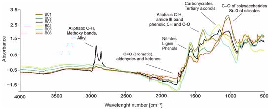 Standardized MIR spectra differed among tested biochars in the intensity of characteristic peaks, particularly in the region of ~1600 to 900 cm−1 and 2800 to 3000 cm−1 (Figure 2). Biochars derived from food leftovers (kitchen waste BC1, coffee grounds BC3) showed relatively high content of aliphatic compounds in their structure, reflected by the intense bands at ~2900 cm−1 (BC3), and ~1400 cm−1 (BC1). Different shapes of spectra were observed for materials produced from high lignocellulosic biomasses, which is particularly visible in the case of BC2 (green grass) and BC6 (wood chips). These biochars are characterized by a more aromatic structure, reflected by the presence of polysaccharides (~1100 cm−1). Nevertheless, in the case of the BC2 sample, the mentioned band may be also due to high ash content in the sample (Table 1). Moreover, BC2 and BC6 spectra have lack of peaks in the regions responsible for aliphatic groups (Figure 2).