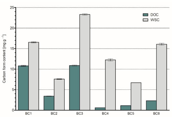 Dissolved organic carbon in water (DOC) content varied among biochars produced from different feedstocks, as biochars made of food waste, like BC1 and BC3, had a remarkably higher presence of this labile carbon fraction (10.91 and 11.01 mg g−1, respectively). At the same time, biochars with the lowest DOC content had the tendency to reveal relatively small amounts of WSC, particularly in the case of BC2 or BC5 (Figure 3). Therefore, the impact of feedstock on biochar properties was clearly noted in labile carbon forms. Content of water-soluble carbohydrates (WSC) analyzed by reaction with anthrone ranged between 6.69–23.30 mg g−1. The highest values were noted for biochars derived from coffee grounds (BC3)—23.3 mg g−1, kitchen waste (BC1) 16.53 mg g−1, and wood chips (BC6)—15.79 mg g−1. The lowest anthrone reactive carbon content was noted in BC2 (green grass) and BC5 (sunflower husks) biochars.