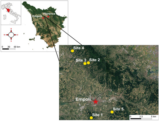 The study was conducted in five olive groves (sites 1–5), characterized by different planting ages, density and management practices (Table 1). The soil texture was mainly sandy loam, even if there were some soil differences among the study sites (Table 1; https://www.regione.toscana.it/-/geoscopio; accessed on 3 March 2022).