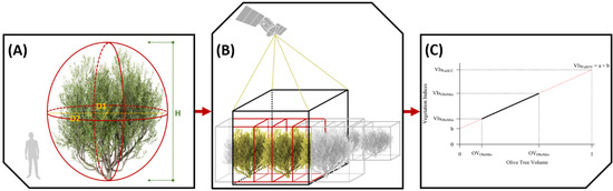 VIs rescaling procedure based on the olive tree volume coverage. (A) Ellipsoid shape of the olive tree calculated on the observed diameter and plant height; (B) estimation of the olive tree volume coverage in the pixel of Sentinel-2; (C) potential Vis’ value extraction based on the previous information. VIsObsMax and VIsObsMin are the maximum and minimum observed VI values for all pixels of the Sentinel-2 image, respectively. OVObsMax and OVObsMin are the maximum and minimum olive tree volume coverage in the Sentinel-2 pixels, respectively. VIsFullCC corresponds to VI at full olive tree coverage.