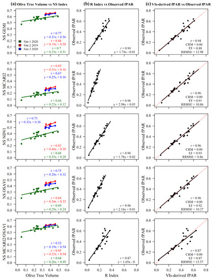 Correlations among the olive tree volume (FC) in the Sentinel-2 pixel and the not re-scaled VIs (a); correlations among the rescaled VIs and the fPAR observed in the Sentinel-2 pixel (b); correlations among observed and simulated fPAR after calibration (c). NS = Not Rescaled; R = Rescaled.